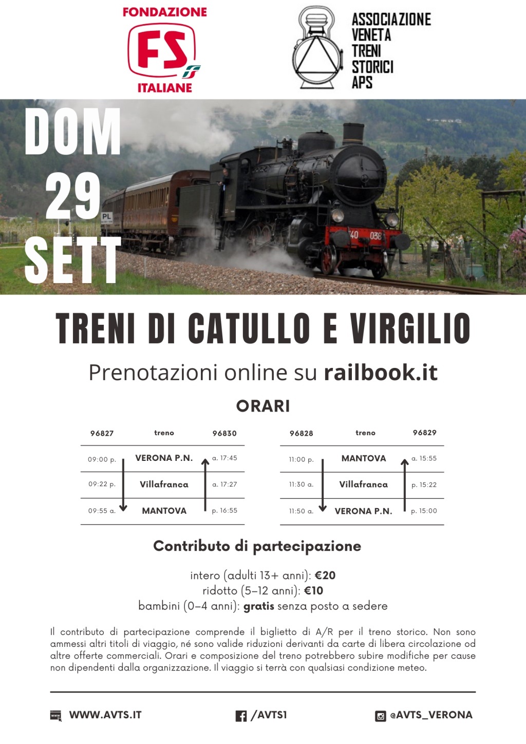 AVTS (Associazione Veneta Treni Storici APS) ha organizzato, per il giorno 29 settembre, un vero e proprio viaggio nel tempo: quattro corse tra Verona e Mantova con un treno speciale, composto di una locomotiva a vapore e carrozze "Centoporte" degli anni '30. Un evento imperdibile per tutti gli appassionati di treni storici e viaggi nel tempo, che potranno percorrere all'insegna dello slow tourism, su un vero treno d'epoca, i binari quotidianamente percorsi da convogli per studenti e lavoratori pendolari.