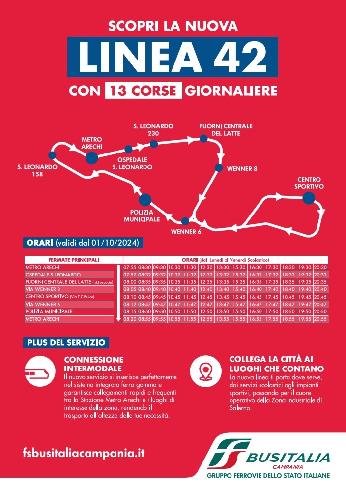 Dal 1° ottobre Busitalia Campania, Gruppo FS, lancia la nuova linea 42, un servizio di collegamento urbano circolare nella Zona Industriale di Salerno. Questo nuovo servizio, progettato su richiesta del Comune di Salerno e avallato dalla Regione Campania, nasce dall'esigenza di migliorare la mobilità all'interno di un'area strategica per la città, offrendo ai cittadini un'opzione di trasporto efficiente e integrata con la rete metropolitana. La linea 42 parte e termina presso la stazione metro "Arechi", consentendo un comodo interscambio modale metro-bus e collegando aree più limitrofe della Zona Industriale, come il Comando di Polizia Municipale in Via dei Carrari, il Centro sportivo e polifunzionale in Via T.C. Felice, l'Istituto scolastico "Focaccia" in Via Monticelli.