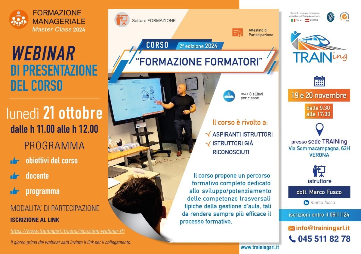 TRAINing organizza la seconda edizione 2024 della master class "Formazione Formatori", corso che si svolgerà in presenza a Verona, presso la sede TRAINing, nei giorni 19 e 20 novembre 2024.