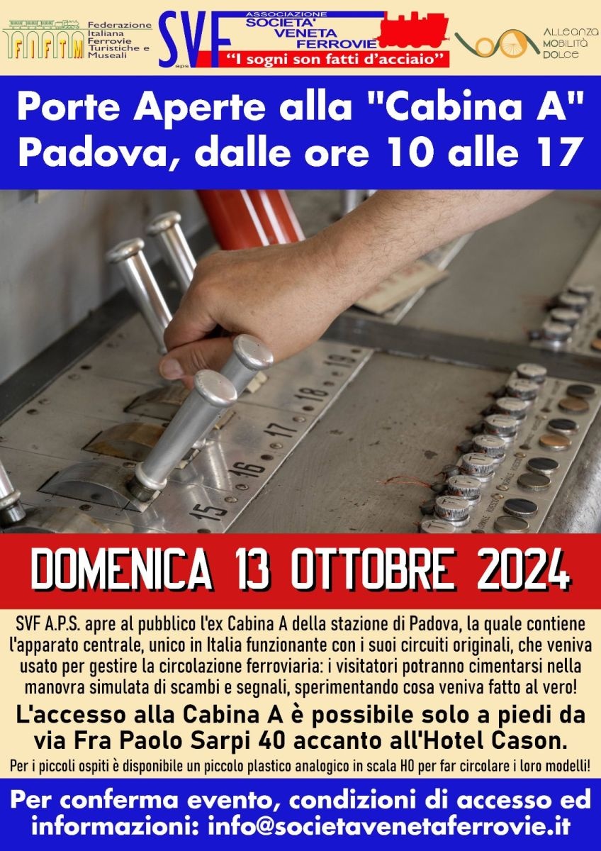 L'associazione Società Veneta Ferrovie APS aprirà, domenica 13 ottobre dalle 10:00 alle 17:00, l'ex Cabina A della stazione di Padova (Via Fra' Paolo Sarpi, 40).