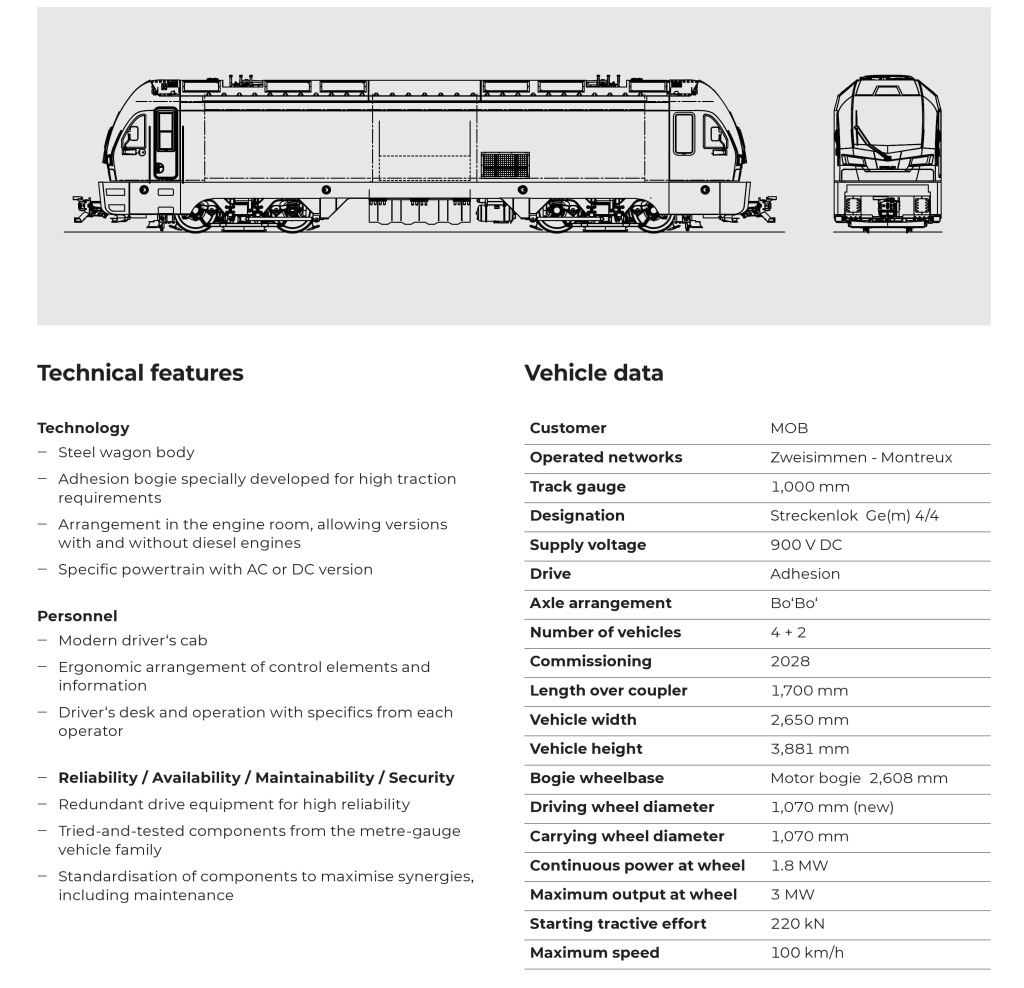 La Montreux Oberland Bernois Railway Company (MOB) e Stadler hanno firmato un contratto per la produzione e la consegna di un totale di sei nuove locomotive a scartamento metrico ad alte prestazioni per il servizio passeggeri e ferroviario. Quattro locomotive elettriche a quattro assi saranno utilizzate per il servizio passeggeri gestito dal treno premium Goldenpass Express sulla linea a scartamento metrico della MOB. Le altre due locomotive ibride identiche sono destinate ai servizi ferroviari e alla manutenzione delle infrastrutture. Grazie a questo ordine, i vecchi veicoli dell'azienda saranno sostituiti da veicoli moderni con il tipico design della famiglia di locomotive Stadler. Le locomotive a scartamento metrico sono state acquistate nell'ambito di una gara d'appalto congiunta con Transports de la Région Morges-Bière-Cossonay (MBC).