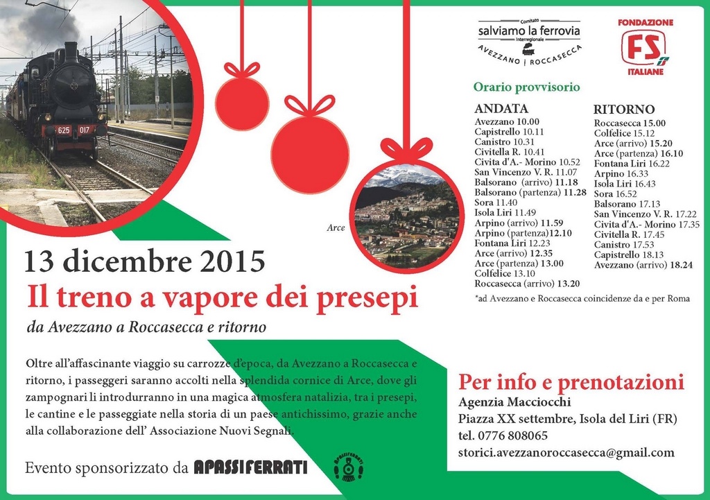 Natale si avvicina e.... sulla Avezzano - Roccasecca tornerà a sbuffare il vapore del Treno dei Presepi! A seguito della grande richiesta, il Comitato Salviamo la Ferrovia Avezzano Roccasecca, con la sponsorizzazione ed in collaborazione con l'Associazione Apassiferrati di Arce ed il Patrocinio del Comune di Arce, organizza un treno a vapore tra montagne, presepi e cantine di degustazione enogastronomica.