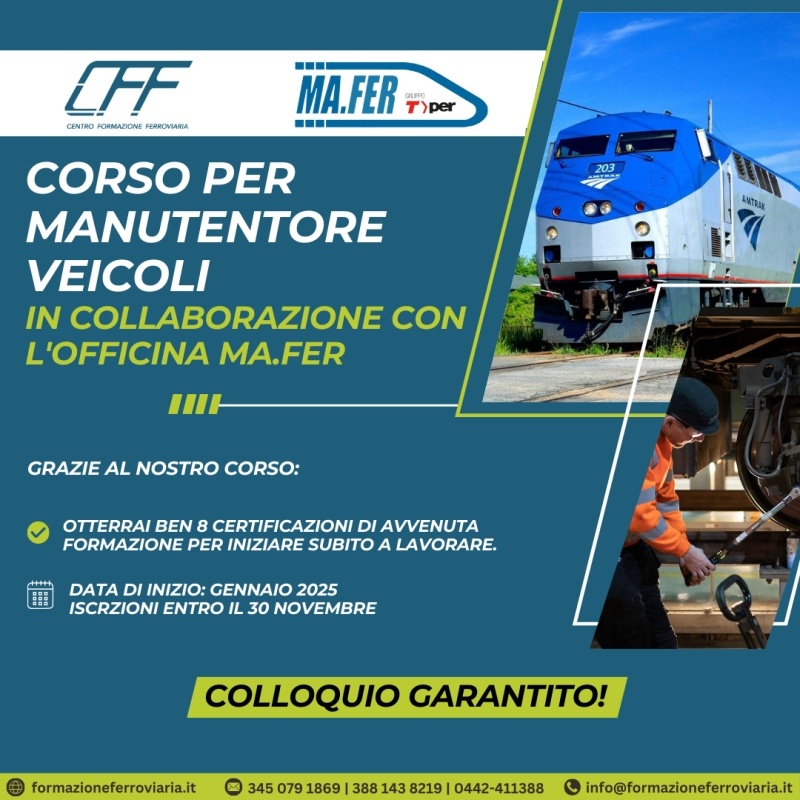 Grazie alla collaborazione tra il Centro di Formazione Ferroviaria (CFF), centro di formazione riconosciuto ANSFISA, e MA.FER S.r.l., azienda leader nel settore della manutenzione dei veicoli ferroviari, è stato pubblicato il bando per la selezione di personale da formare nel settore della Manutenzione Veicoli con possibilità di assunzione.