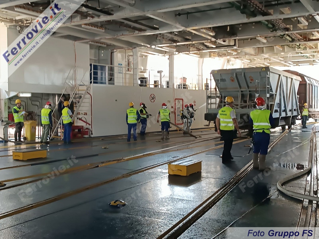 Al contempo vengono attivati anche i protocolli ferroviari interni e viene intercettato il transito di una persona a ridotta mobilità (PRM) previsto lungo il percorso dedicato, adiacente all'invasatura n° 4, nonché predisposte le squadre di emergenza a terra e a bordo nave data anche la presenza di un carro contenente merci pericolose.
