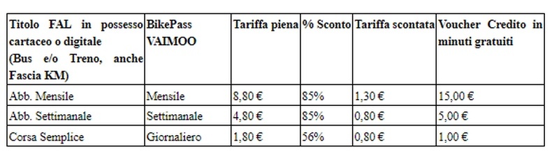 Il servizio di ebike sharing funzionerà con abbonamenti (BikePass) acquistabili in app, più una tariffa per ogni 30 minuti di utilizzo. In caso l'utente sia in possesso di un titolo di viaggio di FAL potrà inserirlo in app alla voce "riscatta codice" prima di acquistare il BikePass per usufruire dei seguenti sconti e Voucher credito in minuti.