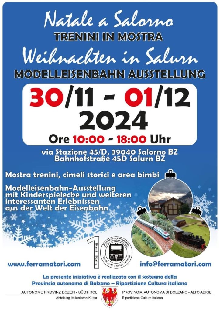 L'Associazione Ferramatori TAA ODV, con sede a Salorno, ha recentemente celebrato l'inaugurazione della sua nuova sede espositiva, e per questa speciale occasione desideriamo offrire a tutti l'opportunità di venirci a visitare. L'invito è rivolto a chiunque voglia conoscerci più da vicino, scoprire la nostra passione per il modellismo ferroviario e vivere un'esperienza unica immersi nel fascino dei trenini in scala. Sarà possibile visitare la nostra mostra storica durante il weekend di sabato 30 novembre e domenica 1° dicembre, dalle ore 10:00 alle ore 18:00, proprio in occasione della prima domenica d'Avvento e della tradizionale festa paesana di Sant'Andrea che si svolgerà sabato a Salorno.