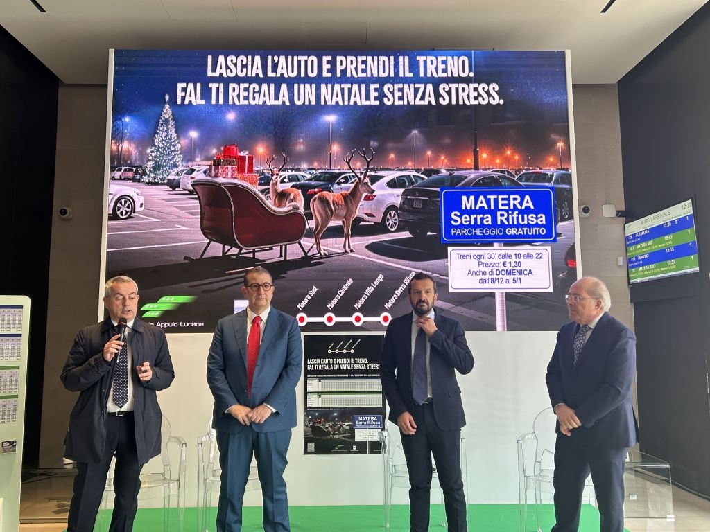 "Lascia l'auto e prendi il treno. FAL ti regala un Natale senza stress". È lo slogan scelto da Ferrovie Appulo Lucane per pubblicizzare il programma di servizi ferroviari domenicali straordinari programmati d'intesa con la Regione Basilicata, da domenica 8 dicembre a domenica 5 gennaio in concomitanza con gli eventi del Natale materano e, in particolare, del Presepe Vivente nei Sassi. Sarà possibile lasciare l'auto gratuitamente nel parcheggio FAL di Serra Rifusa e raggiungere il centro di Matera in treno, con 52 corse ogni 30 minuti dalle 10 alle 22, anche di domenica.
