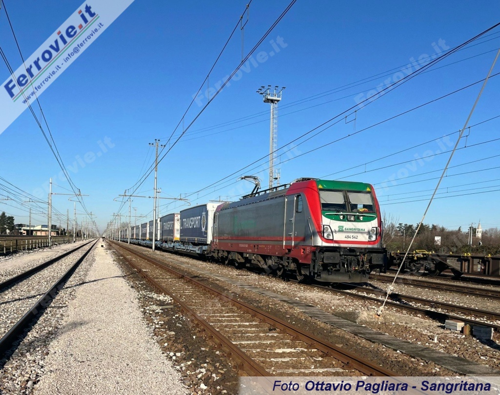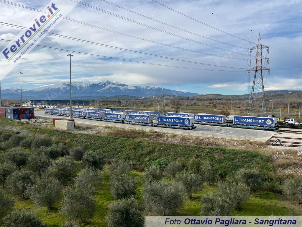 La società Sangritana ha recentemente inaugurato un nuovo servizio ferroviario per il trasporto di semirimorchi, collegando Bologna Interporto a Fossacesia. Il primo treno, affidato alla locomotiva E494.542, ha trasportato semirimorchi della società L. Transport di Pescara. Le fotografie mostrano il treno completo prima della partenza da Bologna Interporto e i carri pronti per lo scarico nel Fascio Saletti, con la Majella sullo sfondo.