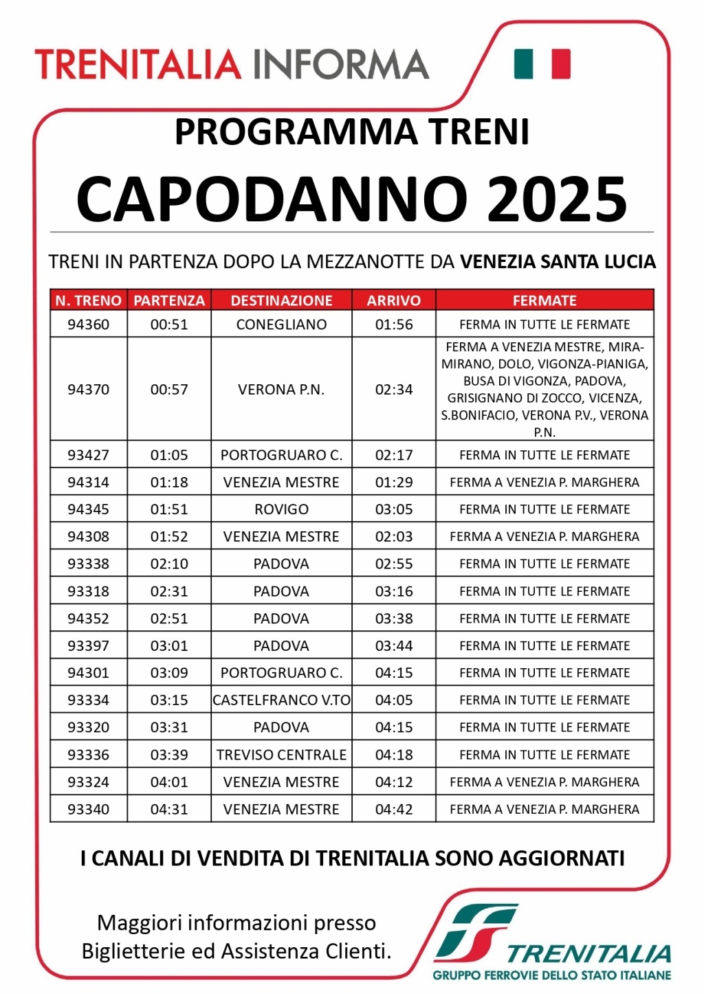 Corse straordinarie in occasione del Capodanno a Venezia. Regionale, in accordo con Regione Veneto, ha previsto più treni Regionali e metropolitani sulle principali linee del veneto oltre il consueto orario di termine, così da consentire un più agevole deflusso dei viaggiatori dopo la mezzanotte. Saranno oltre 60 i ferrovieri in servizio durante la notte per consentire ai turisti ed ai cittadini del Veneto il ritorno a casa dopo i tradizionali fuochi sulla laguna veneziana.