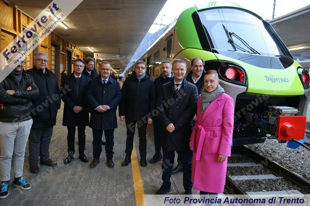È stato presentato questo pomeriggio (10 gennaio) a Trento, al binario 1 della stazione ferroviaria di Piazza Dante, il primo dei 10 nuovi treni che entreranno in servizio in Trentino, alla presenza del Presidente della Provincia Autonoma di Trento, Maurizio Fugatti, dell'Assessore all'Urbanistica, all'Energia e ai Trasporti, Mattia Gottardi, dei rappresentanti delle amministrazioni dei Comuni serviti dalla linea e del Presidente di Trentino Trasporti, Diego Salvatore, dell'Amministratore Delegato e Direttore Generale di Trenitalia, Luigi Corradi, e del Business Development & Public Affair Director di Alstom Ferroviaria, Valter Alessandria.