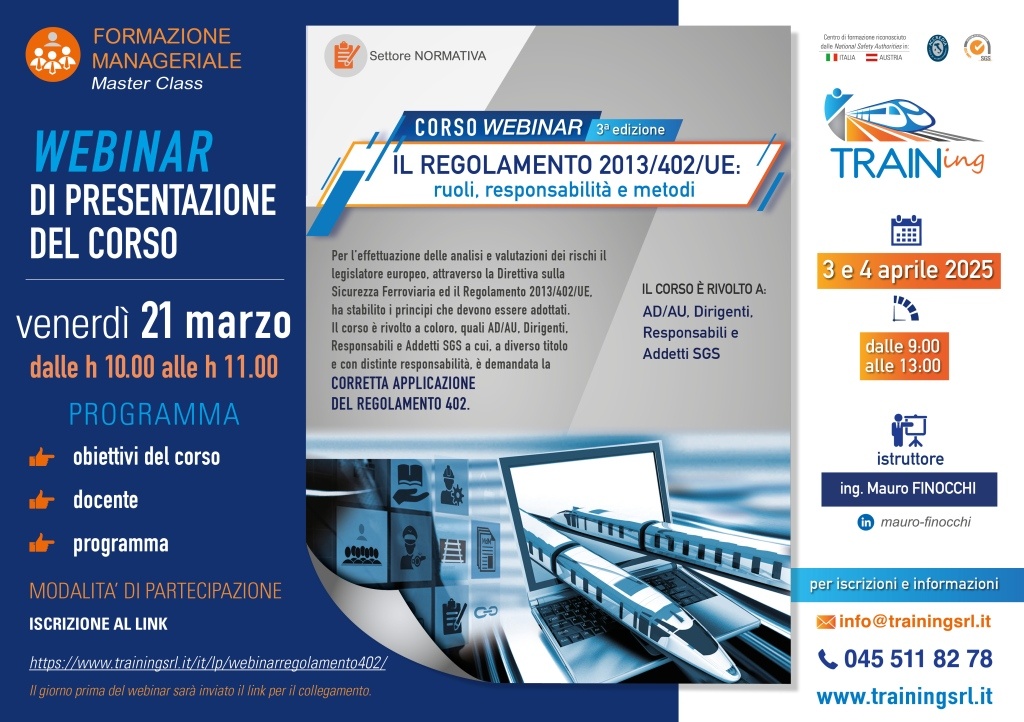 TRAINing organizza la terza edizione della master class "Il Regolamento 2013/402/UE: ruoli responsabilità e metodi", corso che si svolgerà in modalità webinar, nei giorni 3 e 4 aprile 2025.