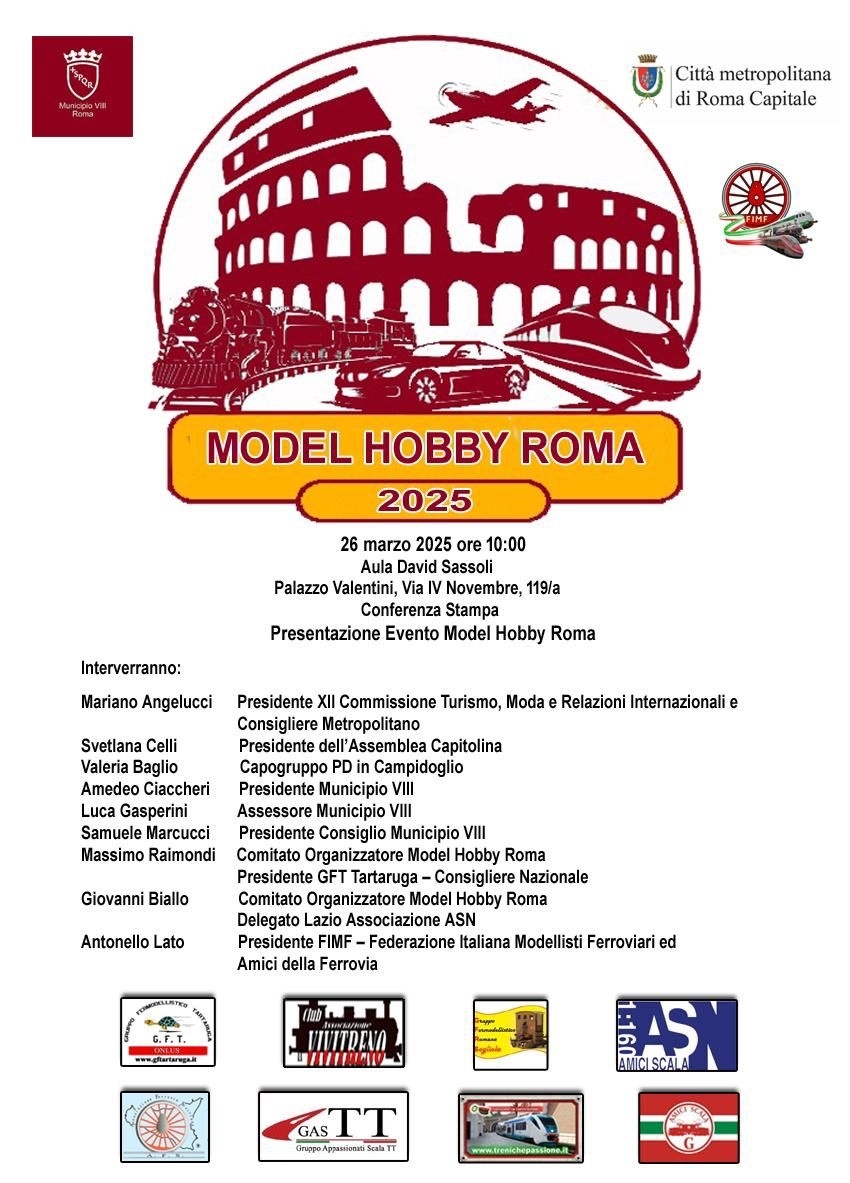 Alla presentazione interverranno rappresentanti istituzionali della Città metropolitana di Roma Capitale e del Municipio VIII, oltre ai membri del comitato organizzatore e delle principali associazioni di settore, tra cui la Federazione Italiana Modellisti Ferroviari (FIMF).
