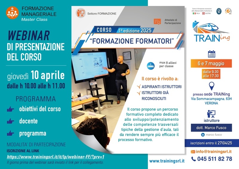 TRAINing organizza la prima edizione 2025 della master class "Formazione Formatori", corso che si svolgerà in presenza a Verona, presso la sede TRAINing nei giorni 6 e 7 maggio 2025.