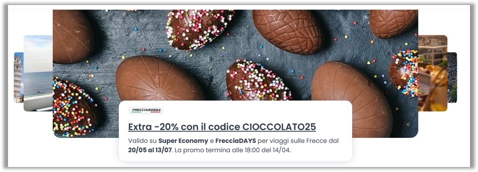 Trenitalia comunica la disponibilità del nuovo codice CIOCCOLATO25 per un extra sconto -20%. Valido su SuperEconomy e FrecciaDAYS per viaggi sulle Frecce dal 20/05/2025 al 13/07/2025. La promo termina alle 18:00 del 14 aprile 2025.