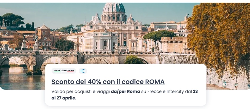 Con il codice ROMA viaggi con lo sconto del 40% sui treni Frecciarossa, Frecciargento, Frecciabianca, Intercity e Intercity Notte.