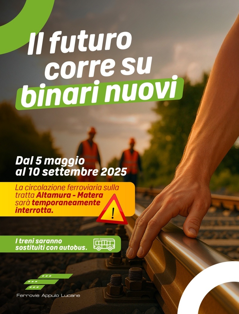 "Il futuro corre su binari nuovi - Stiamo realizzando importanti lavori di rinnovo sulla nostra rete ferroviaria per offrirvi un servizio più efficiente. Dal 5 maggio al 10 settembre 2025, la circolazione ferroviaria sulla tratta Altamura - Matera sarà temporaneamente interrotta e i treni saranno sostituiti con autobus".