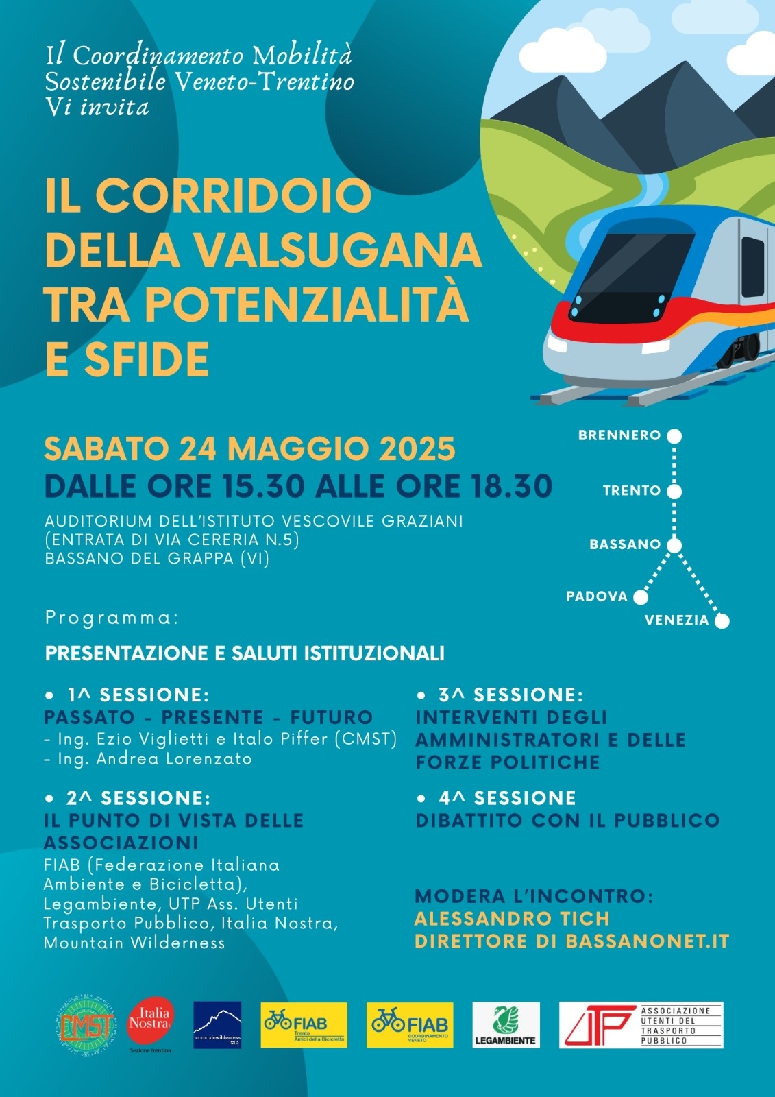 Il Coordinamento Mobilità Sostenibile Veneto-Trentino ha organizzato il convegno "Il corridoio della Valsugana tra potenzialità e sfide", che si terrà il 24 maggio 2025 presso l'Auditorium dell'Istituto Vescovile Graziani, entrata Via Cereria 5, a Bassano del Grappa.