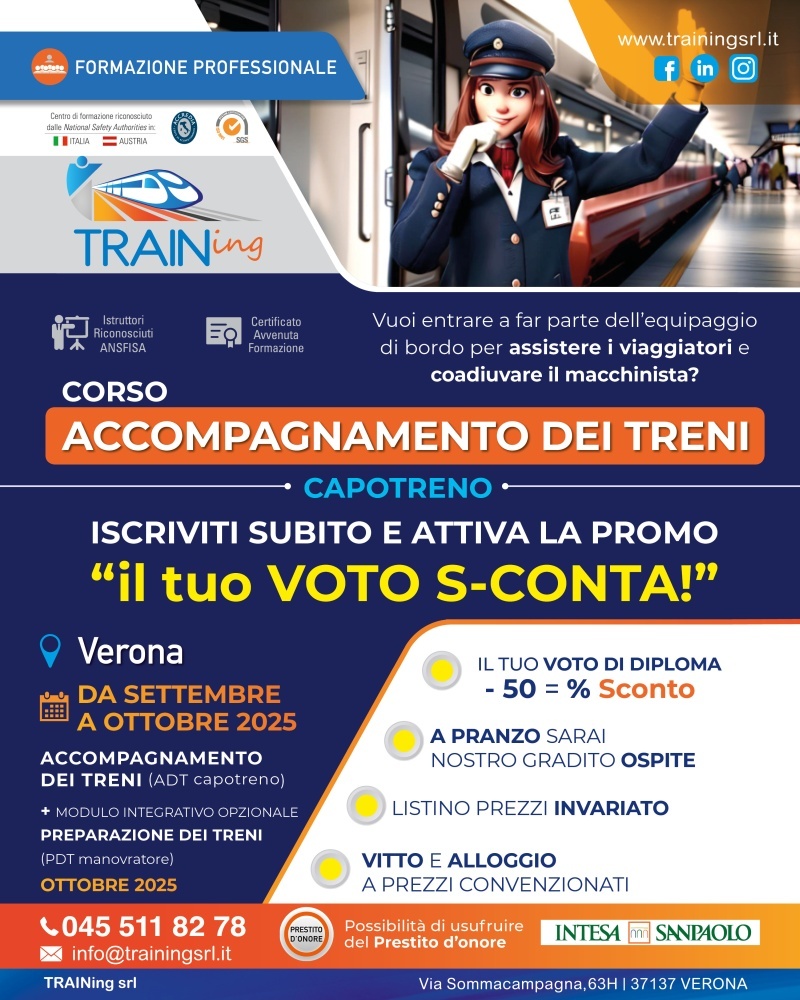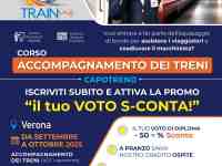 TRAINing annuncia l'avvio del corso a Verona da settembre ad ottobre 2025 "Accompagnamento dei treni (Capotreno)" in promozione: "Il tuo voto s-conta" e non solo!