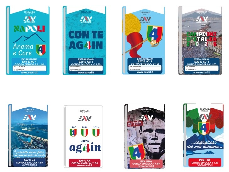 A partire dal 20 giugno saranno disponibili, presso i punti vendita accreditati, i biglietti celebrativi del 4° scudetto del Napoli. Otto differenti titoli di viaggio dedicati all'eccezionale impresa calcistica realizzata dalla squadra del Napoli.