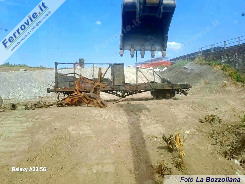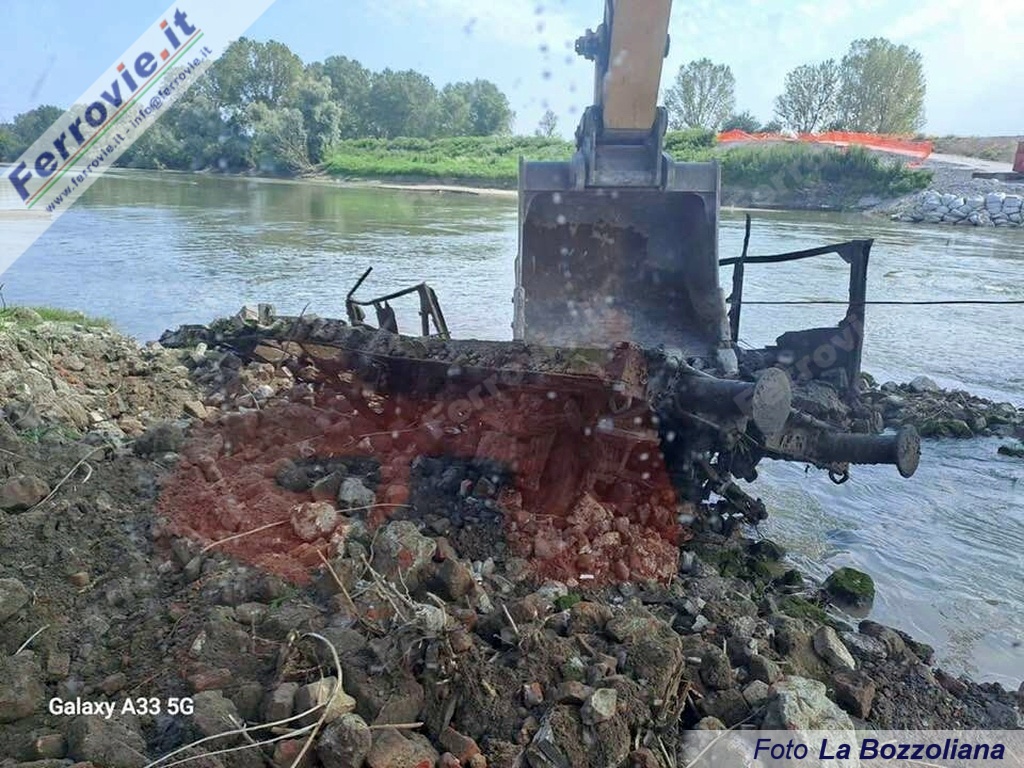 Approfittando del basso livello dell'acqua e mediante un escavatore collocato su un guado temporaneo, è stato possibile rimuovere il telaio deformato ma riconoscibile di un carro ferroviario, insieme ad altri frammenti metallici. Il mezzo è stato adagiato sulla banchina di cantiere, dove sarà sottoposto a valutazioni tecniche e storiche.