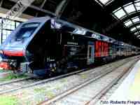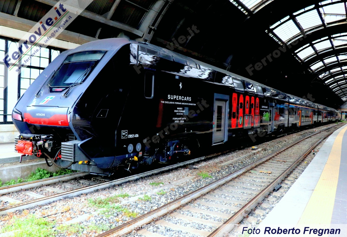 BOLOGNA - Nuova livrea pubblicitaria per Trenitalia Tper. Giovedì 3 luglio è stato riconsegnato all'esercizio l'ETR.521-026, dopo l'applicazione di una livrea promozionale inedita. L'elegante colorazione nera interessa le due casse di estremità dell'elettrotreno, sulle quali sono raffigurate cinque Ferrari di modelli diversi viste dall'alto, per promuovere la mostra "Supercars - The Exclusive Ferrari Collection".