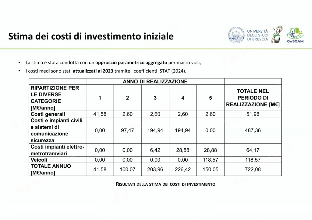 L'investimento stimato è di circa 722 milioni di euro, suddivisi tra opere civili, impianti e materiale rotabile. I costi di esercizio annui sono stimati tra 8,9 e 12,6 milioni di euro.