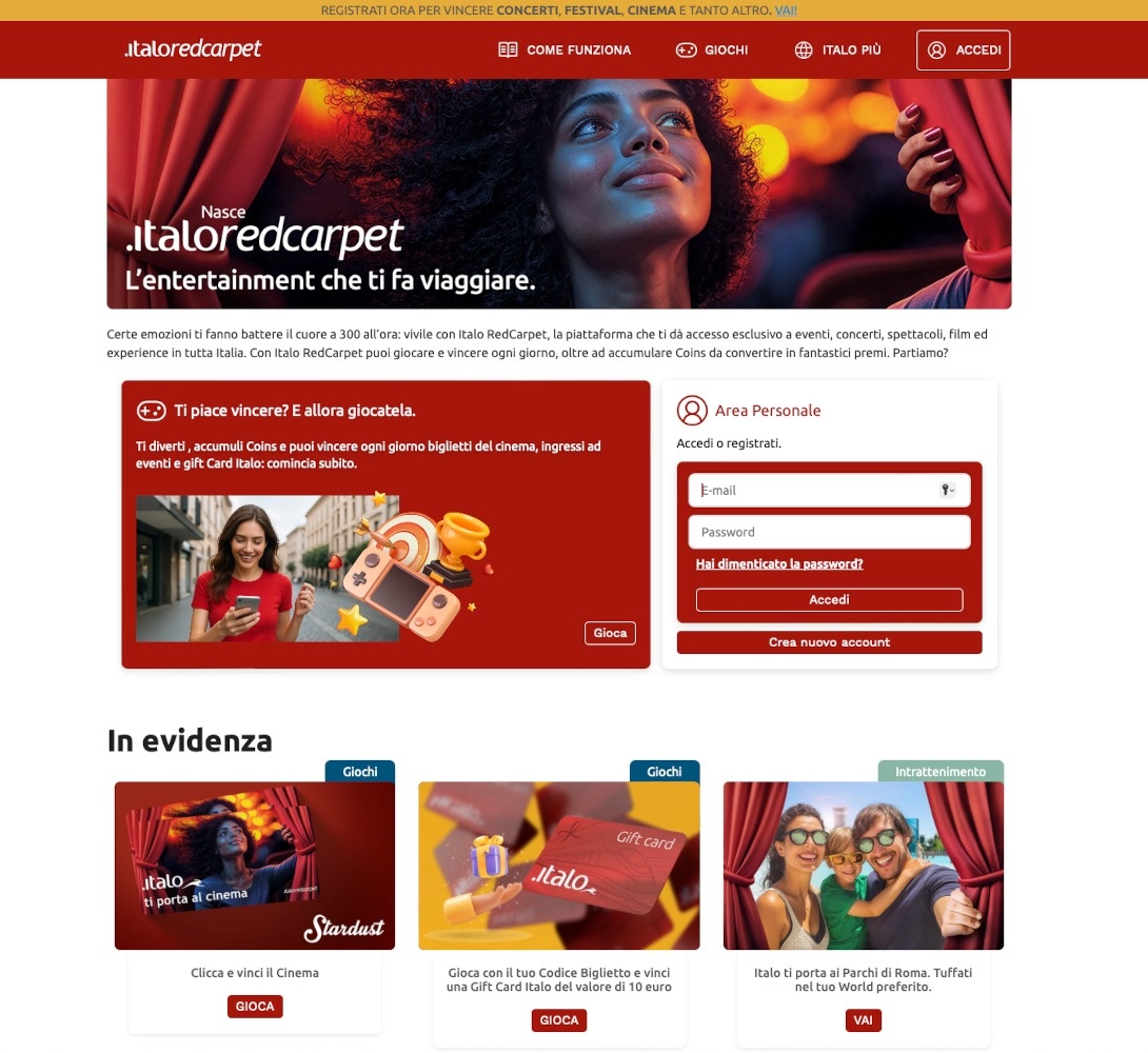 È online "Italo RedCarpet - L'entertainment che ti fa viaggiare", la nuova piattaforma di intrattenimento realizzata da Italo in collaborazione con l'agenzia di entertainment marketing QMI, che regala esperienze esclusive di cinema, musica e cultura a tutti coloro che si iscriveranno e che potranno vincere tramite contest e mini-games l'accesso ad alcuni dei più importanti eventi, festival e musei su tutto il territorio italiano.