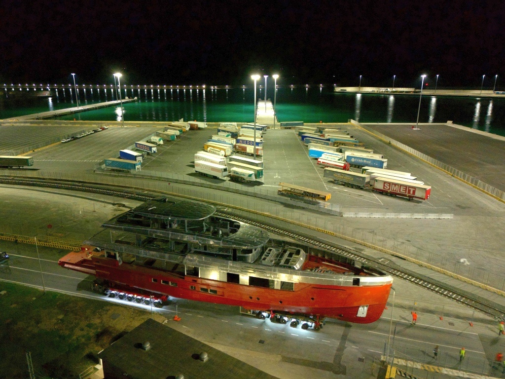 Lo yacht nella nottata è stato posizionato, con l'ausilio di una gru, su dei carrelli (che sostengono un peso di circa 250 tonnellate) e dal cantiere in località "La Mattonara" è arrivato sino alla banchina 31 dove, tra oggi e domani, sarà poi imbarcato sulla nave general cargo barge Karsal diretta a Genova, per essere ultimato e varato.