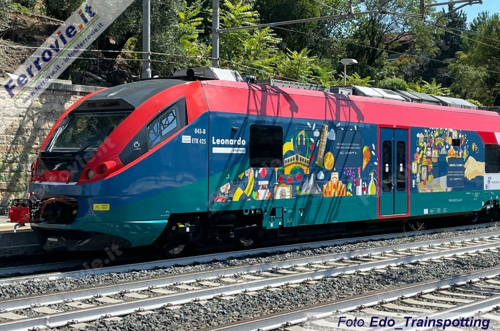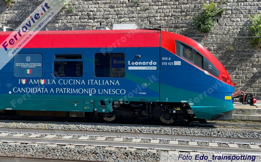 ROMA - È stata presentata questa mattina al binario 1 della stazione di Roma Ostiense una livrea pubblicitaria applicata all'ETR.425-043. Il convoglio, impiegato nel servizio Leonardo Express tra Roma Termini e l'aeroporto di Fiumicino, è il primo nella storia recente del collegamento aeroportuale romano a ricevere una livrea promozionale. L'iniziativa promuove la candidatura della Cucina Italiana a Patrimonio Culturale Immateriale dell'Umanità UNESCO.