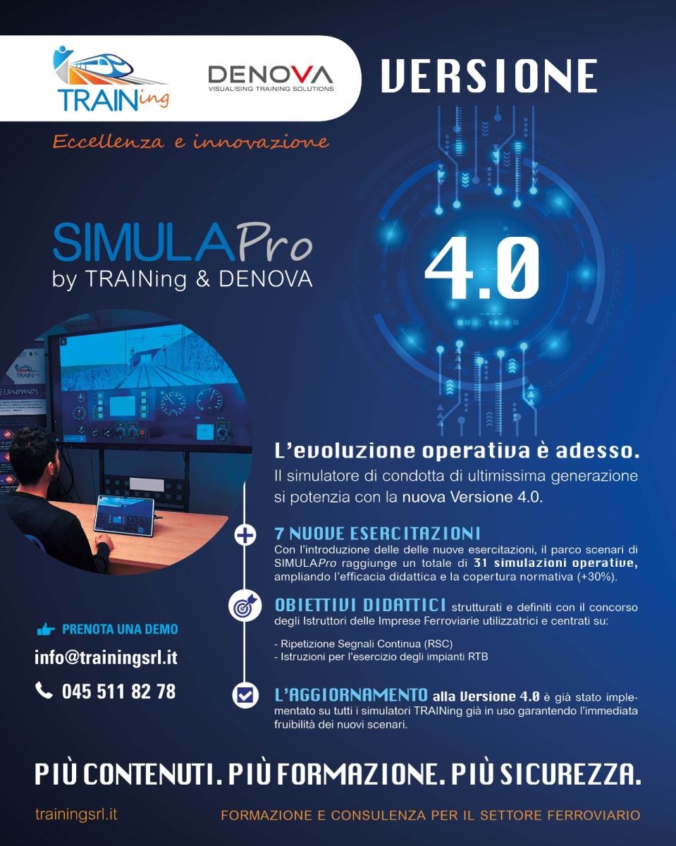 TRAINing Srl ha pubblicato la nuova versione 4.0 del SIMULAPro (https://www.trainingsrl.it/it/simulatore/), già distribuita a tutti i clienti, con nuovi obiettivi didattici strutturati e definiti anche con il concorso degli Istruttori delle Imprese Ferroviarie utilizzatrici.