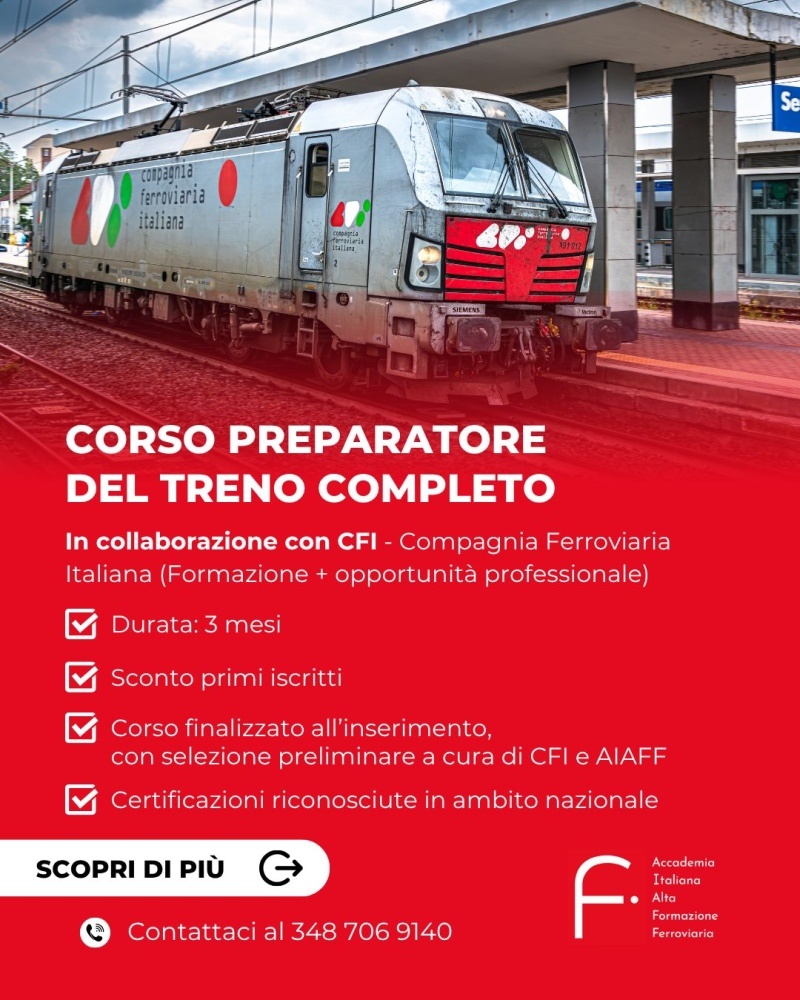 AIAFF - Accademia Italiana di Alta Formazione Ferroviaria - in collaborazione con Compagnia Ferroviaria Italiana (CFI), apre le selezioni per il Corso Preparatore del Treno - PDT Completo, con assunzioni garantite al termine del percorso formativo, superato con successo.