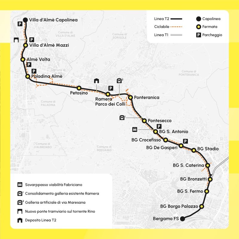 TEB Bergamo ha aggiornato alcuni nomi delle fermate previste sulla futura Linea T2. Contestualmente è stata pubblicata la nuova mappa, che riporta le principali opere in corso di realizzazione lungo il tracciato e i parcheggi di interscambio previsti.