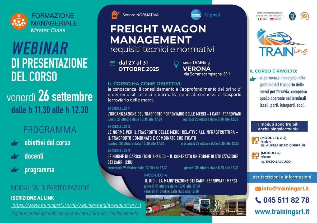 TRAINing organizza l'edizione 2025 della master class "Freight Wagon Management", corso che si svolgerà in presenza a Verona presso la sede di TRAINing dal 27 al 31 ottobre 2025.