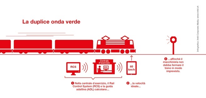 Esempio: un treno merci del peso di 1000 tonnellate che da una velocità di 80 chilometri all'ora rallenta fino a fermarsi e poi riprende a muoversi, consuma una quantità di corrente pari a quella utilizzata da una famiglia media in una settimana. La cosiddetta «onda verde», chiamata anche guida adattiva (ADL), consente al macchinista di ottimizzare la marcia del treno e di evitare le fermate prima dei segnali rossi. Questo sistema riduce in egual misura sia il consumo di energia, sia i costi energetici e ha come effetto secondario positivo che i veicoli e le rotaie sono meno soggetti a usura. L'«onda verde/ADL» fa in modo che si verifichino molte meno fermate impreviste davanti ai segnali di arresto, incrementando la puntualità dei treni.