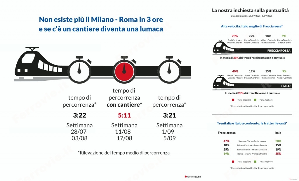 Secondo i dati, il 31% dei Frecciarossa non rispetta l'orario programmato, con punte drammatiche sulla dorsale adriatica: sulla Bari-Milano oltre il 70% dei treni è arrivato in ritardo, mentre sulla Salerno-Torino la percentuale supera il 50%. Anche sulla direttrice principale Milano-Roma si registrano ritardi rilevanti (18% dei treni da Milano e 25% da Roma).