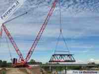 Sul lato Bozzolo è entrata in azione una gru Tadano CC 38.650 da 625 tonnellate, mentre dal lato Marcaria ha operato una Demag CC6800 con una capacità nominale di 1.250 tonnellate.