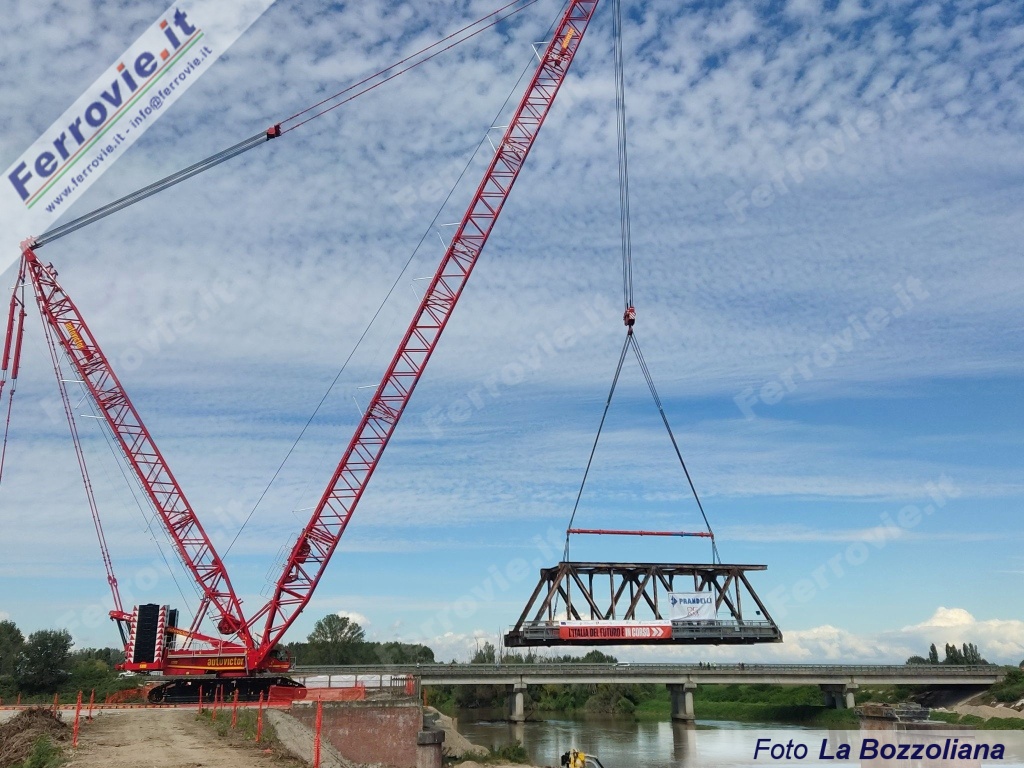 Il vecchio ponte, ricostruito tra il 1945 e il 1946, era costituito da tre campate reticolari in acciaio: due laterali di circa 40 metri e una centrale di 48 metri. Nei giorni scorsi, l'impalcato è stato "svarato" con un'imponente operazione di sollevamento che ha visto in azione due tra le gru cingolate più potenti d'Europa.