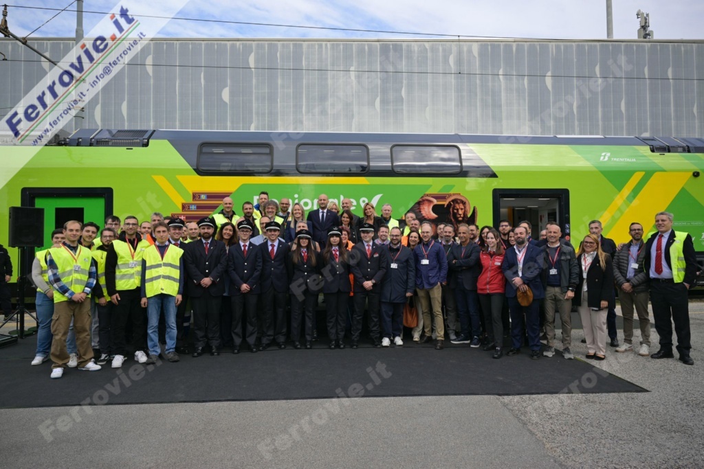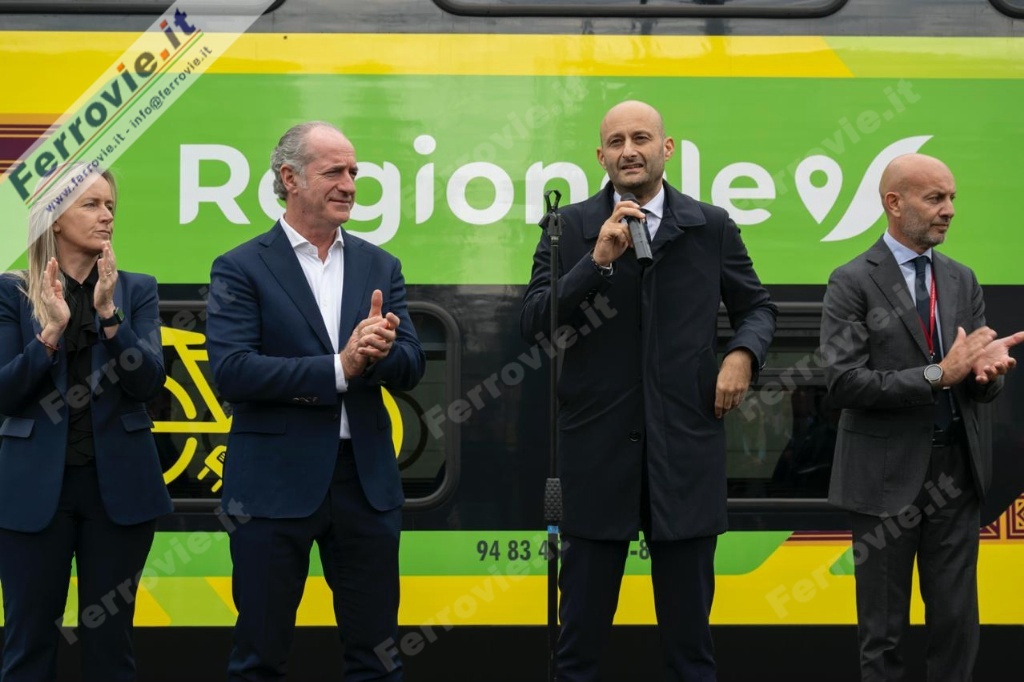 A presentare il nuovo treno, nell'Impianto di Manutenzione Ciclica di Venezia Mestre: Luca Zaia, Presidente della Regione del Veneto, Elisa De Berti, Vicepresidente e Assessore ai Lavori Pubblici - Infrastrutture - Trasporti della Regione del Veneto, Gianpiero Strisciuglio, Amministratore Delegato e Direttore Generale di Trenitalia e Maria Annunziata Giaconia, Direttore Operations Regionale di Trenitalia, oltre ad un rappresentante del Comune di Venezia.