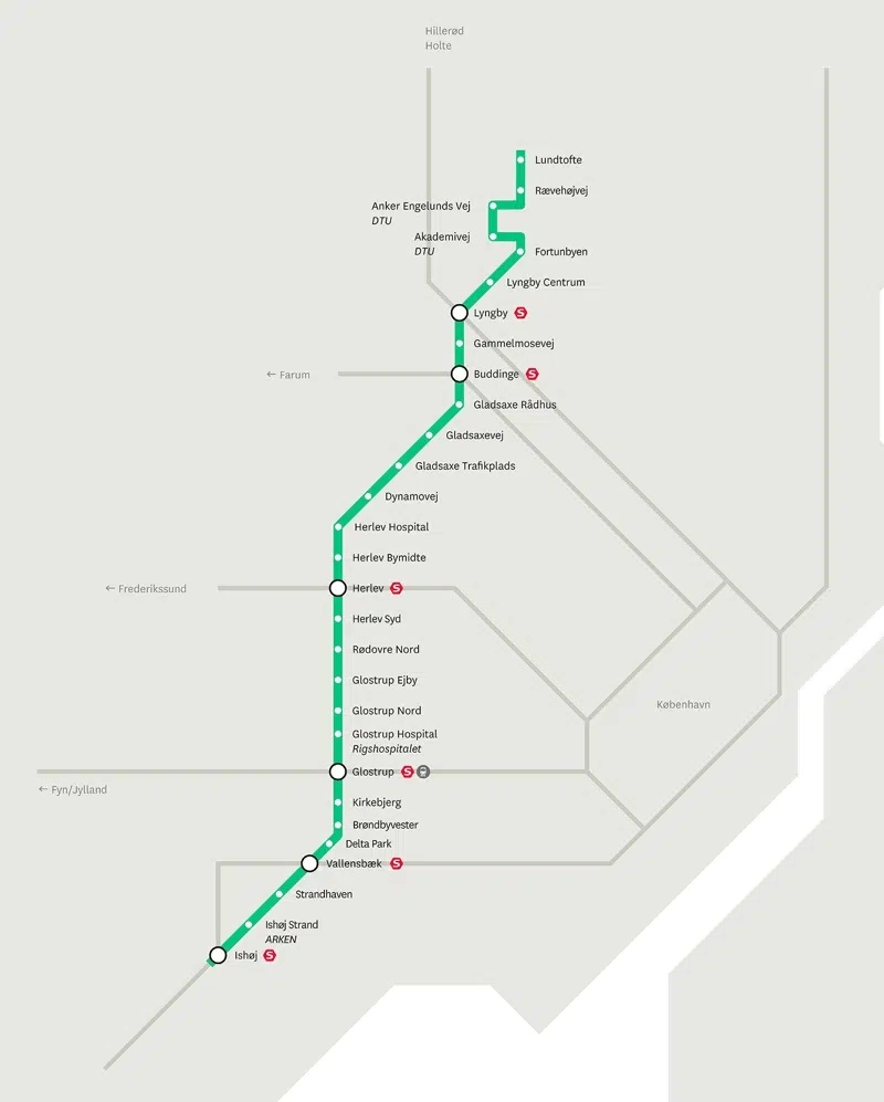 La nuova tranvia è piuttosto periferica ed è stata concepita principalmente come collegamento fra le linee ferroviarie suburbane (S-Tog) al fine di evitare di dover arrivare fino alle stazioni di Copenhagen per poter interscambiare con altre linee S-Tog. Esistono tuttavia dei piani che prevedono la realizzazione di una diramazione verso il centro della città.