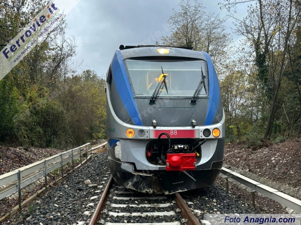 ISOLA DEL LIRI (Frosinone) - Un treno regionale è deragliato questa mattina, venerdì 21 novembre, tra Sora e Roccasecca a causa di una frana provocata dalle forti piogge cadute nelle ultime ore. Lo svio ha interessato il carrello anteriore del Regionale 20184 Cassino - Avezzano, effettuato con il Minuetto Diesel n. 88, tra Arce e Fontana Liri.