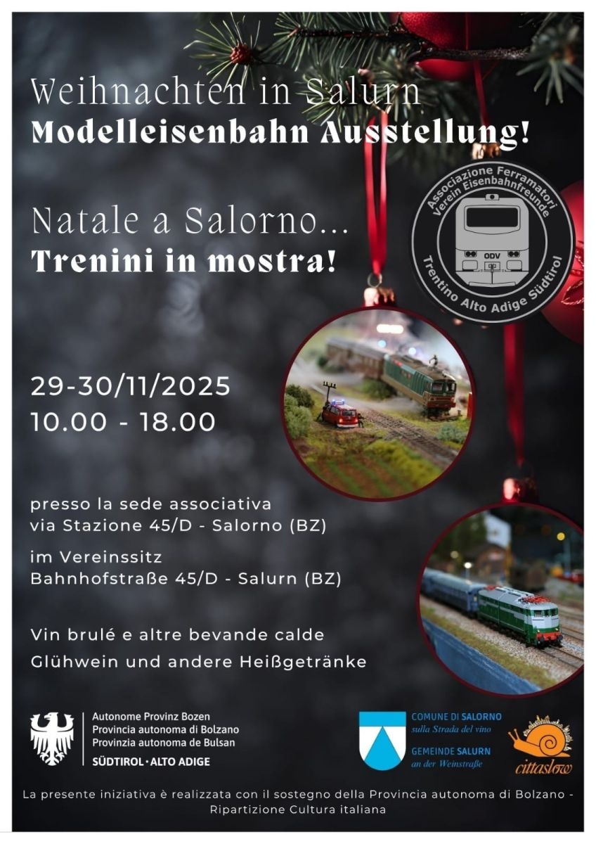 Torna a Salorno la tradizionale Mostra di Modellismo Ferroviario "Natale a Salorno - Trenini in mostra!", organizzata dall'Associazione Ferramatori TAA ODV, in programma nel weekend di sabato 29 e domenica 30 novembre 2025, dalle ore 10:00 alle 18:00, presso la sede associativa situata nell'ex magazzino merci della stazione ferroviaria di Salorno (BZ), in Via Stazione 45/D. L'ingresso è gratuito.