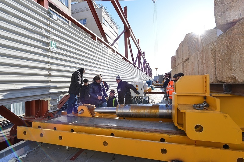 Nel fine settimana scorso, senza alcuna ripercussione per l'esercizio ferroviario, quattro potenti martinetti hanno spinto per oltre 16 metri la prima sezione del parcheggio che sarà realizzato sopra i binari della stazione. Durante la prima spinta, per garantire il corretto bilanciamento della struttura, è stata applicata una zavorra di circa 1200 tonnellate.