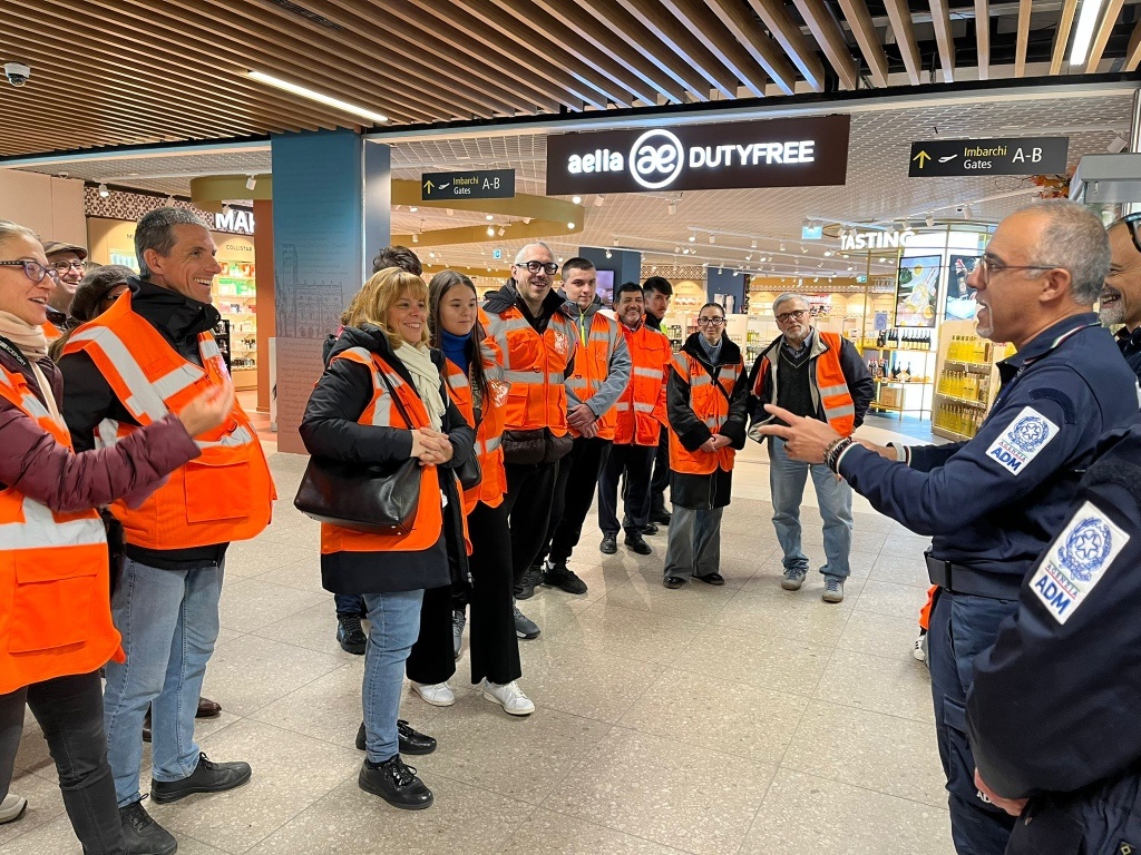 All'aeroporto Marco Polo di Venezia, dopo una presentazione generale, gli ospiti sono stati accompagnati in una visita immersiva nell'affascinante contesto lagunare, con un racconto a tappe fatto di conoscenza ed esperienza diretta, che ha restituito la specificità dello scalo ubicato tra acqua e terra e che, come tale, richiede attente e costanti attività di controllo e tutela ambientale. Raggiunta a bordo di un autobus interpista la fascia stradale interna che costeggia la laguna, atterraggi e decolli sono stati osservati da un'inedita prospettiva ravvicinata, con sullo sfondo il terminal passeggeri e, a lato, il nuovo ampliamento in fase di realizzazione. Da qui l'incontro con l'unità di controllo di SAVE specializzata nell'utilizzo dei falconi per la sicurezza dei voli, una tecnica antica e nel contempo di elevata efficacia. Sosta successiva, il presidio dei Vigili del Fuoco che, con consueta generosità, hanno illustrato le caratteristiche degli automezzi in dotazione, dimostrandone l'utilizzo con particolare entusiasmo per gli ospiti più piccoli che sono stati fatti salire nella cabina di guida.
