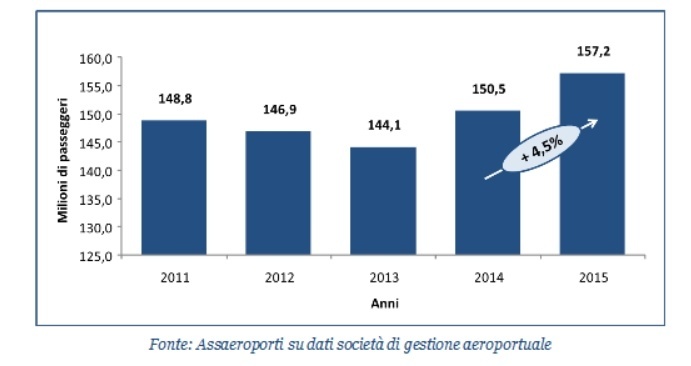 Nello specifico, nel corso del 2015, nei 35 scali aeroportuali italiani monitorati da Assaeroporti sono transitati complessivamente 157.200.746 passeggeri, corrispondenti a quasi 7 MLN di passeggeri in più rispetto al 2014.