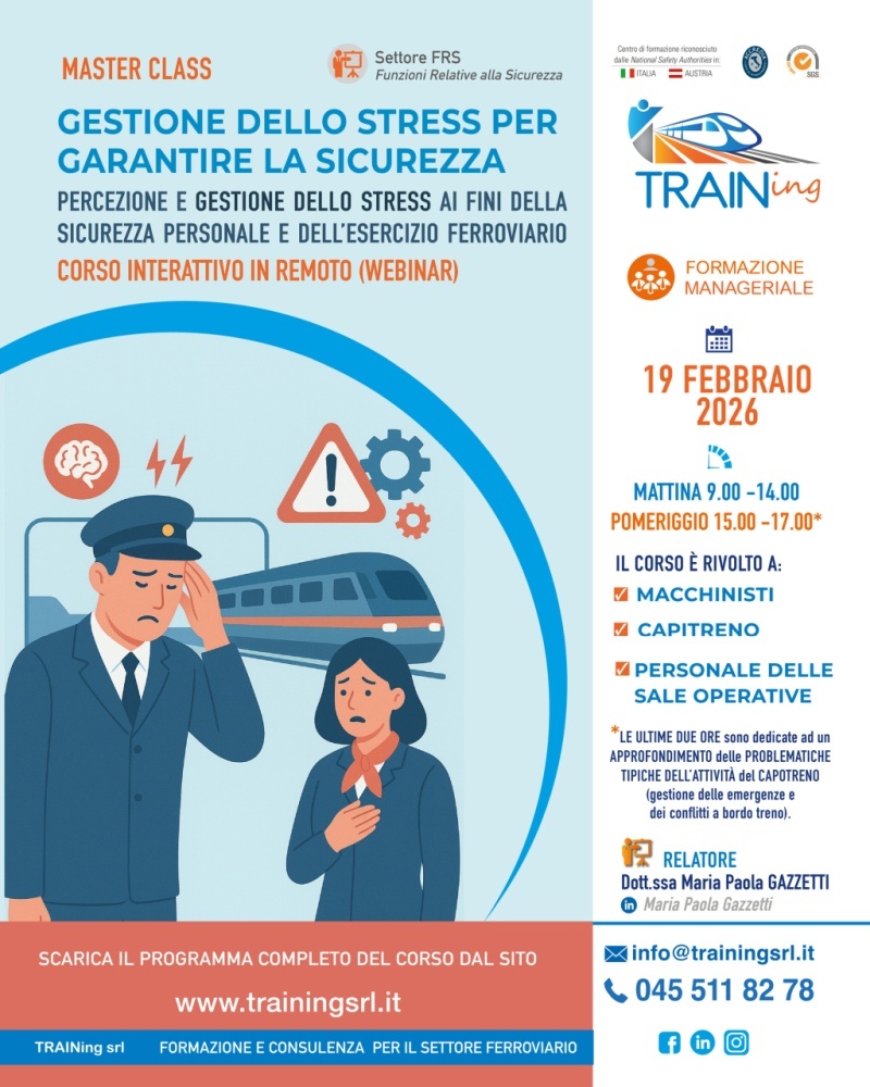 TRAINing Srl ha programmato la nuova master class "Gestire lo stress per garantire la sicurezza. Percezione e gestione dello stress ai fini della sicurezza personale e dell'esercizio ferroviario".