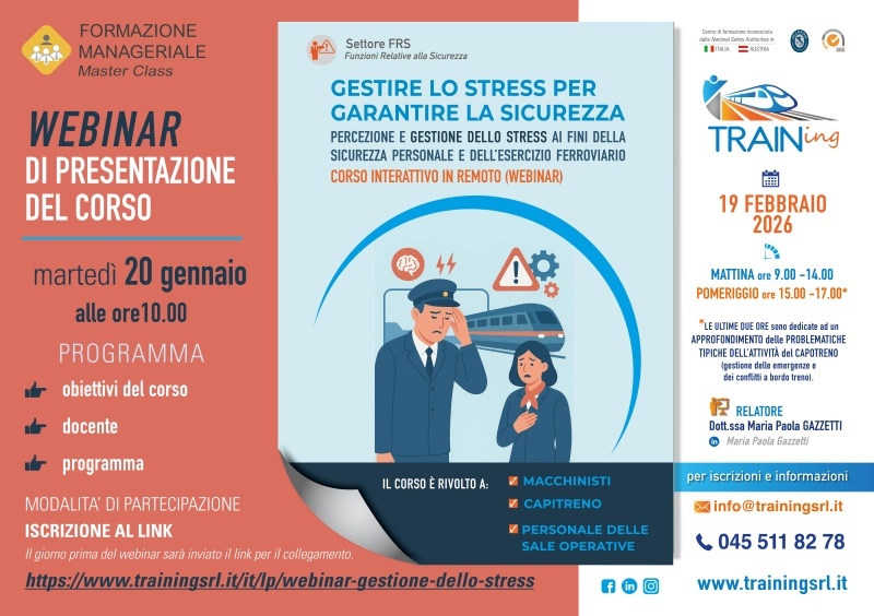 TRAINing ha organizzato la prima edizione della nuova master class "Gestire lo stress per garantire la sicurezza", destinata a macchinisti, capitreno e personale delle sale operative e che si svolgerà il 19 febbraio 2026 in modalità webinar.