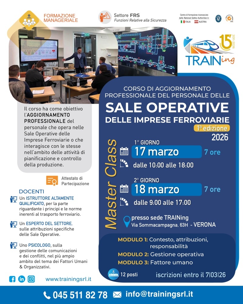 TRAINing Srl ha programmato la prima edizione 2026 della nuova master class: Corso di aggiornamento professionale del personale delle "Sale Operative delle Imprese Ferroviarie".