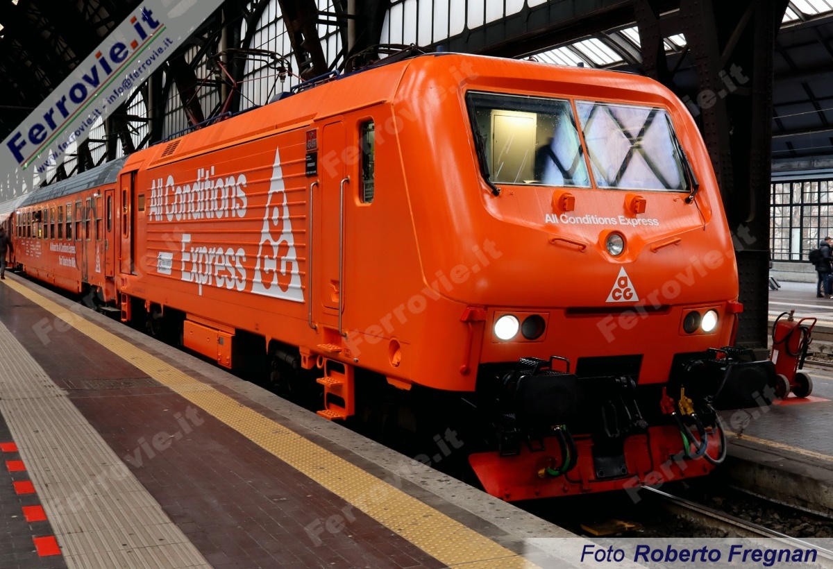 MILANO - Prime immagini della composizione in livrea Nike ACG-Strava di cui abbiamo scritto ieri (vedi News ferroviarie del 02/02/2026). La composizione è oggi impegnata in una corsa prova da Milano Centrale a Abbadia Lariana, con le E.464.520 e 880 in doppia simmetrica con 5 carrozze intermedie tra cui UIC-X con cuccette e Z1.
