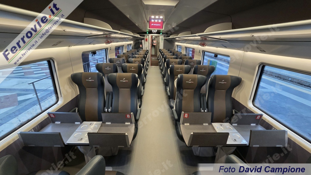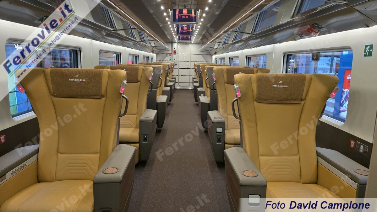 La nuova "F" di Frecciarossa fa la sua comparsa anche sulle porte di salita ed anche a bordo, con il nuovo marchio che compare sui menù della Executive, sui poggiatesta di tutti i quattro livelli (Executive, Business, Premium e Standard) e comunque su tutte le iscrizioni di bordo.