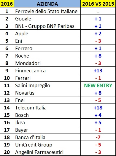 Il gruppo ha guadagnato nuovamente il "vertice" della classifica superando, ancora una volta, importanti aziende nazionali e internazionali da sempre apprezzate dai giovani per innovatività e vision. Un traguardo che è arrivato contestualmente all'opera di risanamento e di rilancio delle FS Italiane di questi ultimi anni: partendo dalla 15a posizione nel 2009, FS si è classificata 13a nel 2010, 8a nel 2011, 3a nel 2012, 2a nel 2013, 3a nel 2014, fino al raggiungimento della cima della classifica l'anno scorso.